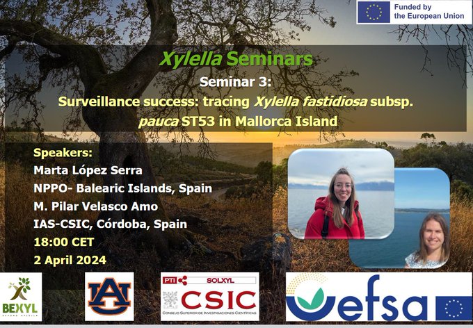 El 2 de abril de 2024 se celebró un **seminario organizado por el Consejo Superior de Investigaciones Científicas (CSIC) bajo el título “Surveillance success: tracing Xylella fastidiosa subsp. pauca ST53 in Mallorca Island”. Este seminario formó parte de un ciclo de actividades enfocadas en la investigación y manejo de la bacteria Xylella fastidiosa y estuvo disponible en el canal de divulgación científica “Soluciones a Xylella fastidiosa” del CSIC.