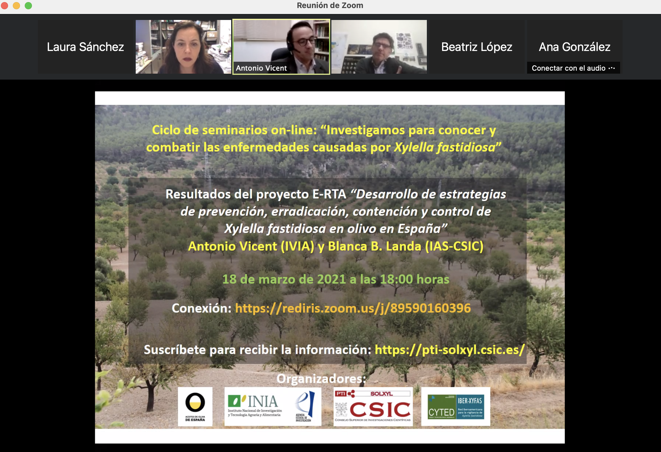 Nello specifico, la conferenza intendeva presentare il progetto «Sviluppo di strategie per la prevenzione, eradicazione, contenimento e controllo della Xylella fastidiosa negli ulivi in Spagna». L’obiettivo del PTI SolXyl con questo ciclo di seminari online, non è altro che diffondere i progressi nella ricerca sulla Xylella fastidiosa in diverse colture.